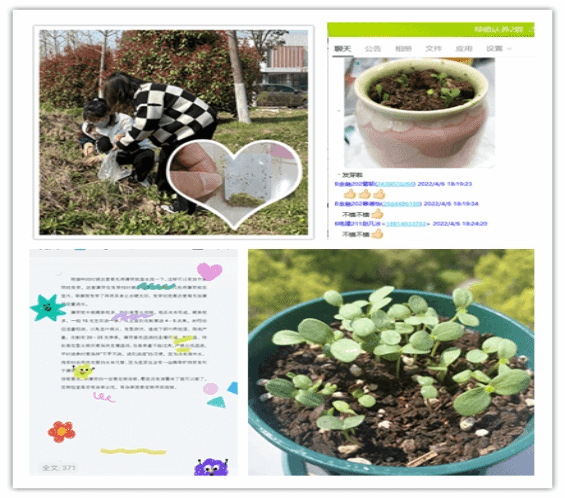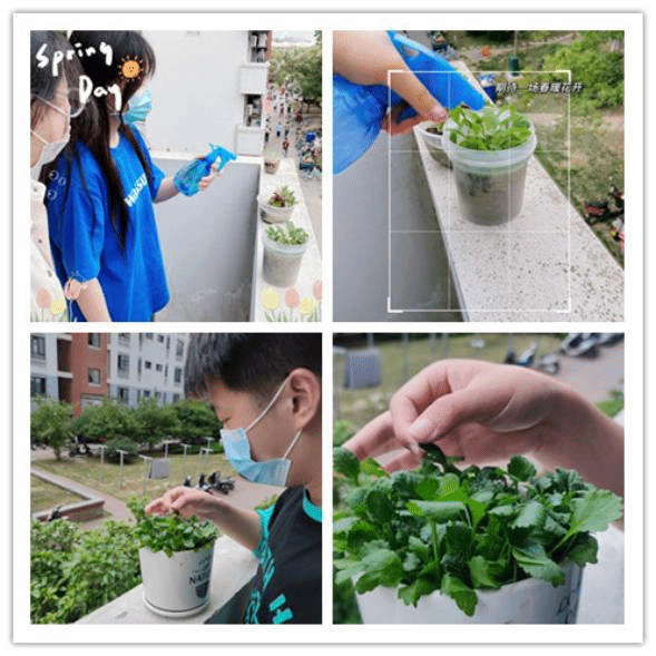 本次“绿植领养”活动实现线上线下紧密融合互动,学生参与热情高涨、反响热烈。活动开始,因为受疫情形势严峻的影响,种植条件有限,同学们自己带着小铲子在学校的花坛边、松树下挖土,用吃过的外卖盒和剪断的饮料瓶底做花盆。怀着忐忑而又虔诚的心情种下种子,浇水、晒太阳、拍照、记录打卡几乎成了同学们每天的“必修课”。交流群里常常是这一方请教取经,虚心学习,那一方交流共享,共同提高,互帮互助的友爱氛围蔚然成风。 在大家的悉心照料下,整个校园线上线下,绿意盎然,花草葱郁,一派生机。