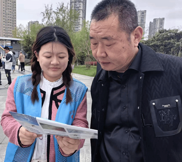 在富康社区广场,B统计222班团支部成员向社区居民分发湿地生态保护宣传彩页,并耐心解答居民提出的各类问题,引导广大社区居民自觉践行生态文明理念,共建美丽宜居家园。