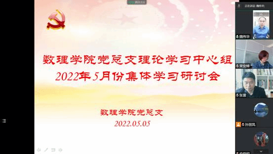 5月5日下午,数理学院党总支理论学习中心组通过腾讯会议开展线上集体学习研讨会,数理学院党总支书记魏伟华主持,校党委第三巡学旁听组组长张雷、成员束安娣到会指导,数理学院党总支理论学习中心组全体成员参会。