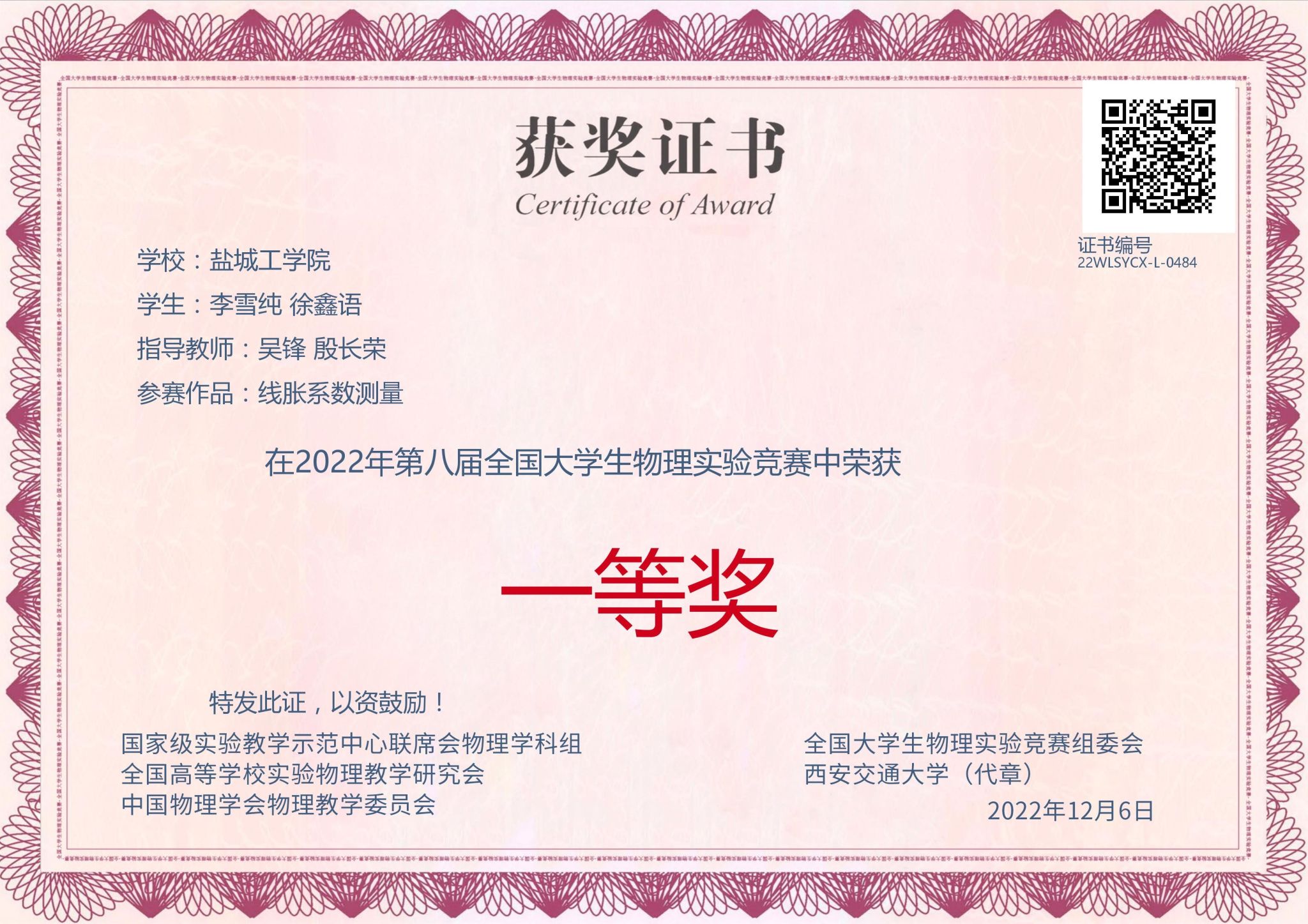 经过决赛的激烈角逐,我校参赛的5支队伍全部获奖。其中,由程鲲老师、吴兆丰老师指导的作品《液体表面张力系数的变化规律探究及实验装置改进》取得了“自选类”竞赛国家一等奖。由吴锋老师、殷长荣老师指导的作品《线胀系数测量》取得了“讲课类”竞赛国家一等奖。