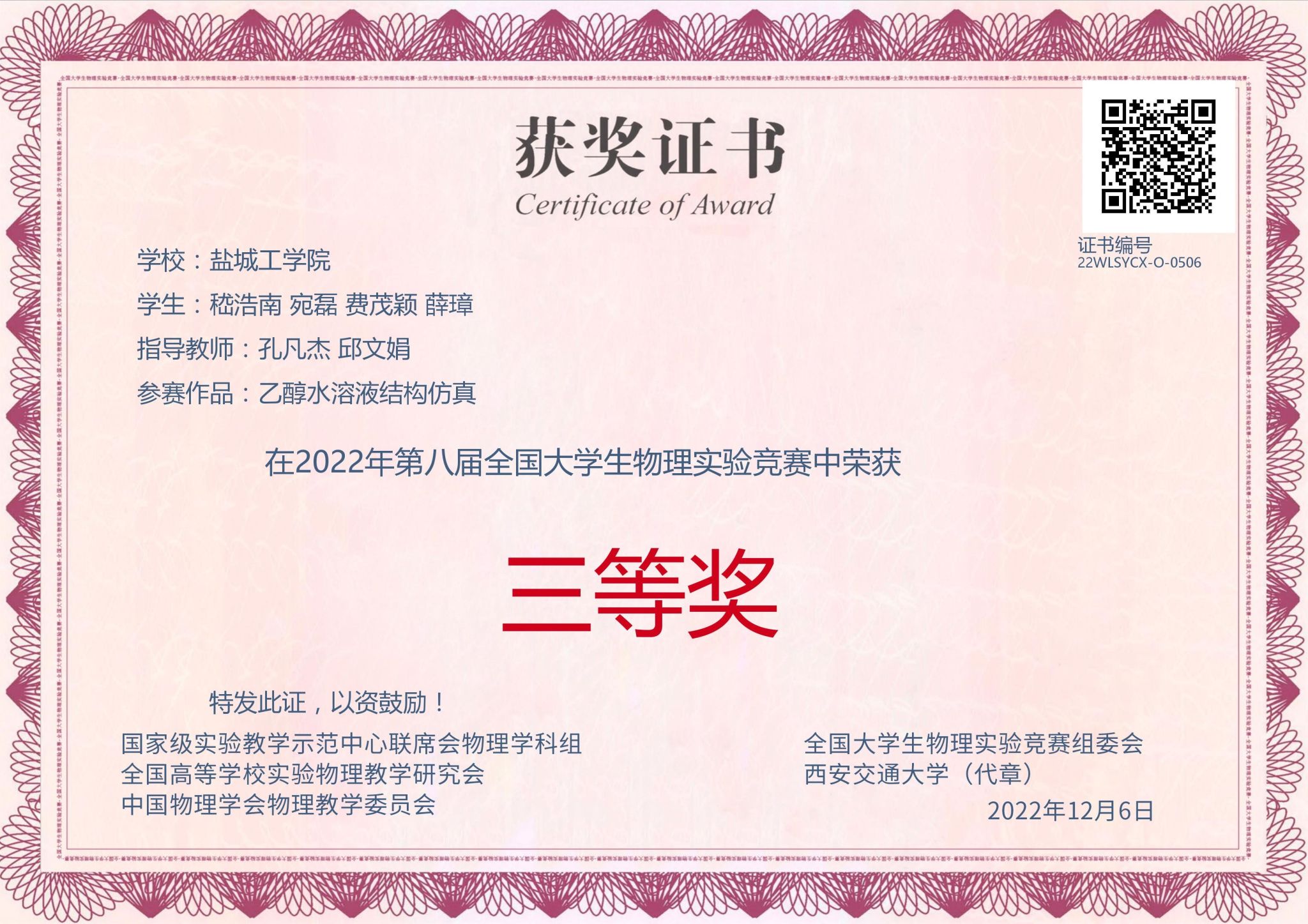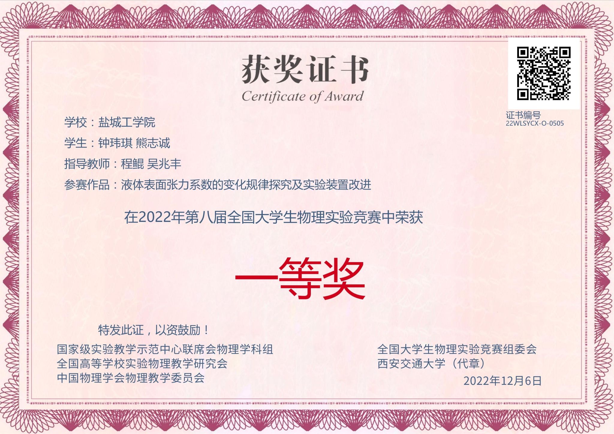 近日,2022年第八届全国大学生物理实验竞赛(创新赛)比赛结果揭晓,我校学子喜获一等奖2项,二等奖1项,三等奖2项。盐城工学院获本次竞赛的优秀组织奖。