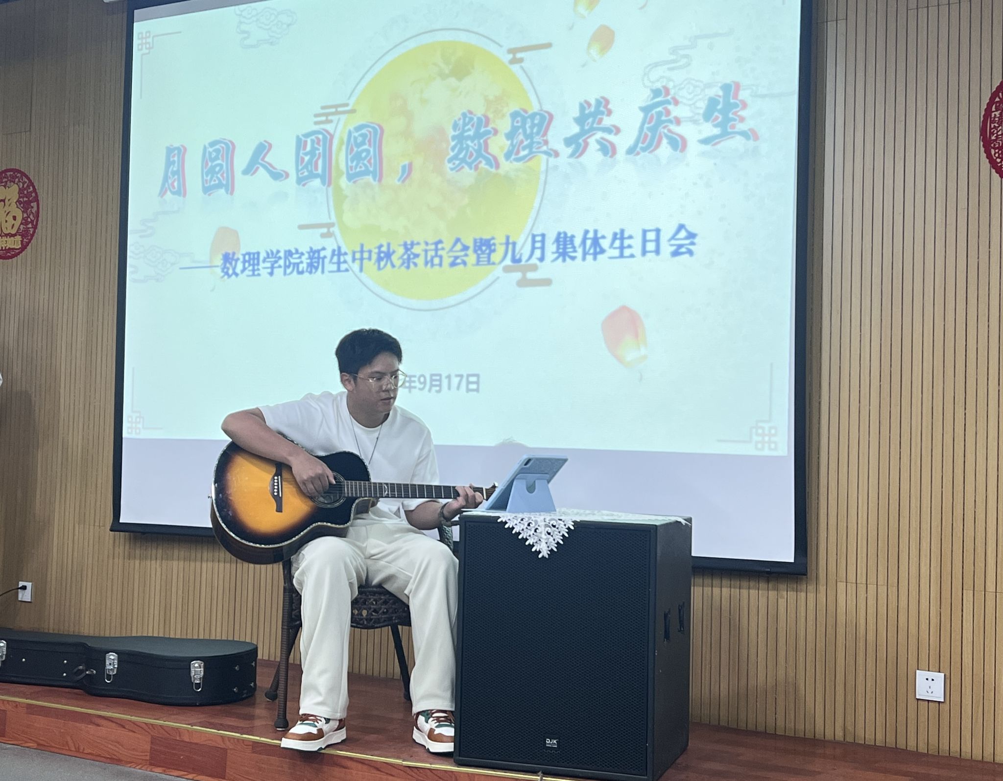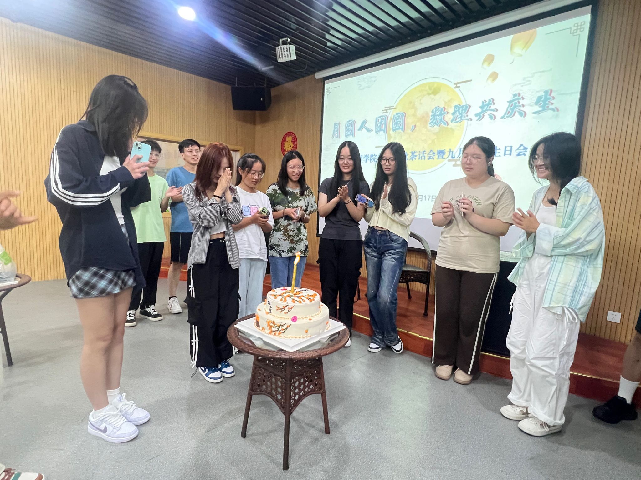 数理共庆生。活动的高潮部分,便是学院特地为阳历九月过生日的新生们准备了充满美好寓意的生日蛋糕。新生们在热烈的掌声中走上台,在大家的祝福声中许下心愿,共同吹灭蜡烛,共享这份甜蜜。这一刻,生日的喜悦和中秋的团圆氛围完美融合,让每一个人都感受到了满满的幸福。