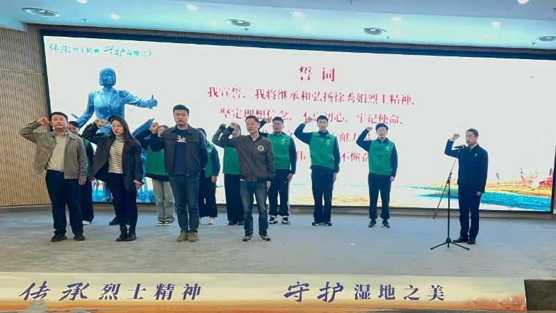 团日共建活动还先后举行了徐秀娟烈士纪念仪式,“赓续烈士精神 书写滩涂故事”主题党课,“丹顶鹤”杯全国中小学生自然笔记获奖作品公布,以及新时代传承徐秀娟烈士精神沙龙访谈等活动,徐秀娟黄海湿地保护志愿者协会志愿者代表们现场聆听徐秀娟烈士的生平事迹介绍,感悟“鹤魂精神”的磅礴力量。
