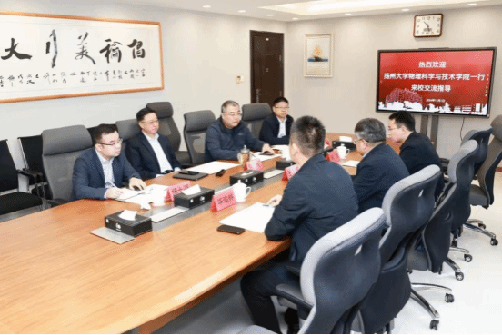 薛浩详细介绍了我校的历史发展以及办学特色,希望两校数理专业在人才培养、师生交流、科学研究等方面广泛开展合作,对数理学科发展进行深入交流,并深情回忆在扬州大学求学期间的难忘经历。数理学院院长徐宁介绍了学院发展历程和基本情况,就学科建设、专业建设、科学研究、人才培养、考研就业、学科竞赛等内容进行交流,并深入探讨了明年第一届本科毕业生考研就业等情况。王春雨介绍了扬州大学物理科学与技术学院基本概况、人才培养、专业建设、科学研究等情况。他希望今后能够进一步加强交流,在师资队伍建设、人才培养、科学研究、校地合作等方面学习借鉴经验,期待携手同行,共同发展。