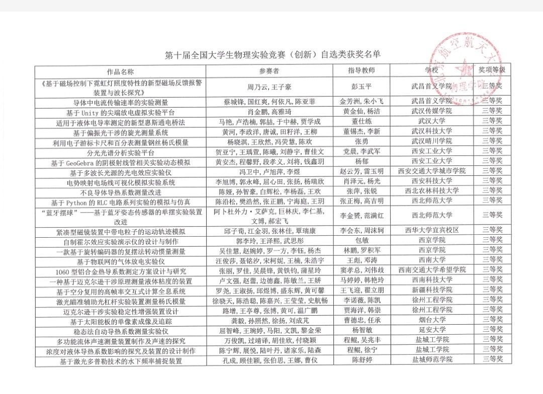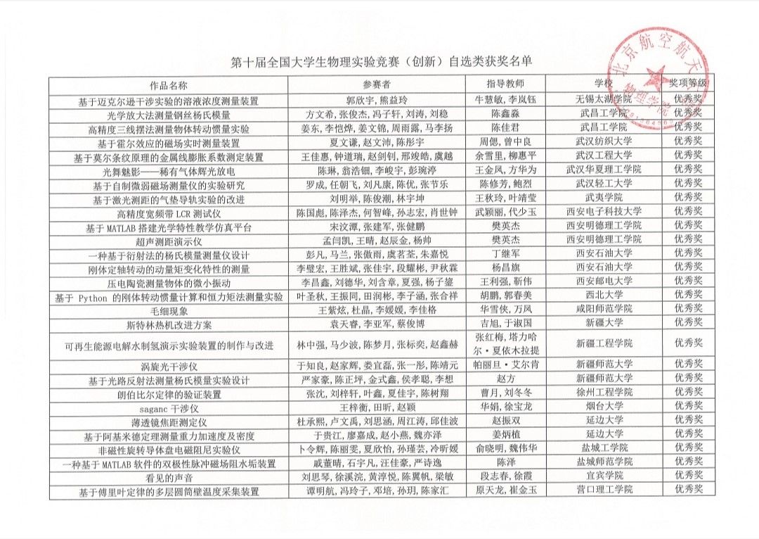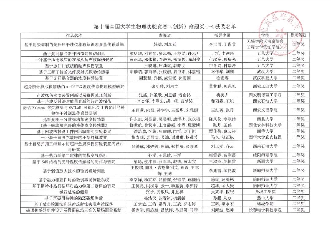 近日,第十届全国大学生物理实验竞赛(创新赛)结果公布,盐城工学院推荐的6支参赛队斩获二等奖2项,三等奖3项,优秀奖1项,学校获得优秀组织奖。