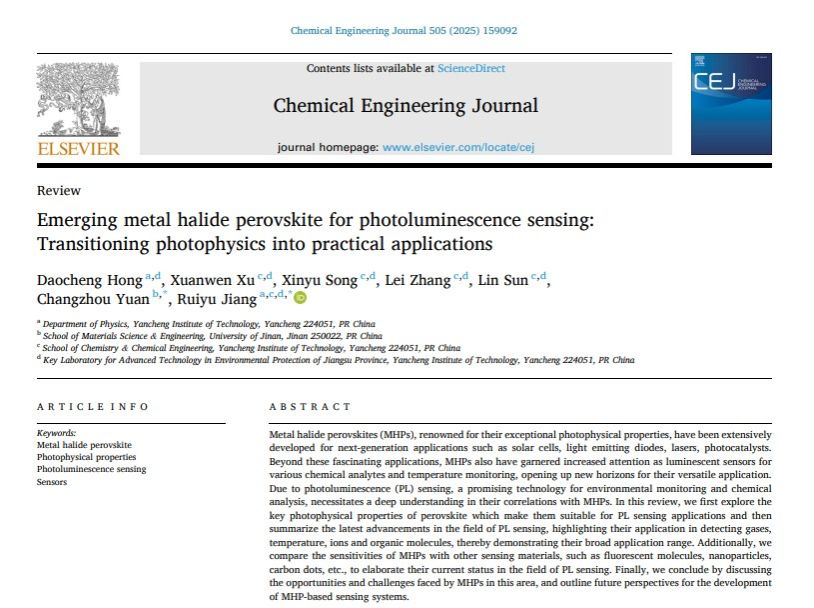 近日,我院洪道程博士(第一作者)和姜瑞雨教授(通讯作者)与济南大学原长洲教授合作,盐城工学院第一单位,在化工领域TOP期刊《Chemical Engineering Journal》(IF = 13.4)上发表题为“Emerging Metal Halide Perovskite for Photoluminescence Sensing: Transitioning Photophysics into Practical Applications”的学术论文。