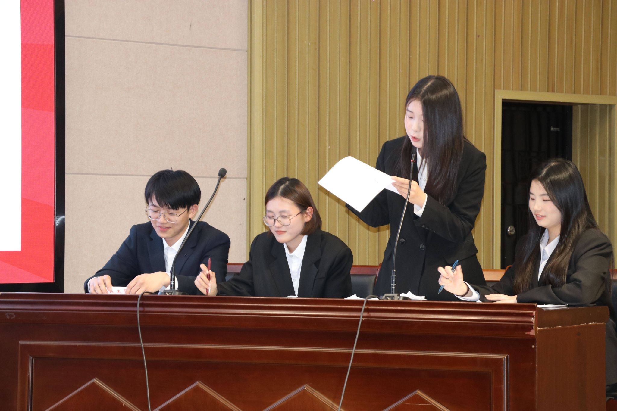 学生评委分别围绕两支队伍的逻辑思维、临场应对、团体配合等方面对本次辩论赛进行了总结评价,并在辩驳思路、语言表达等方面指出了选手们的不足之处,帮助选手们有效提高了辩论能力和技巧。经过评比,最终正方代表队凭借优异的辩论表现获得冠军。