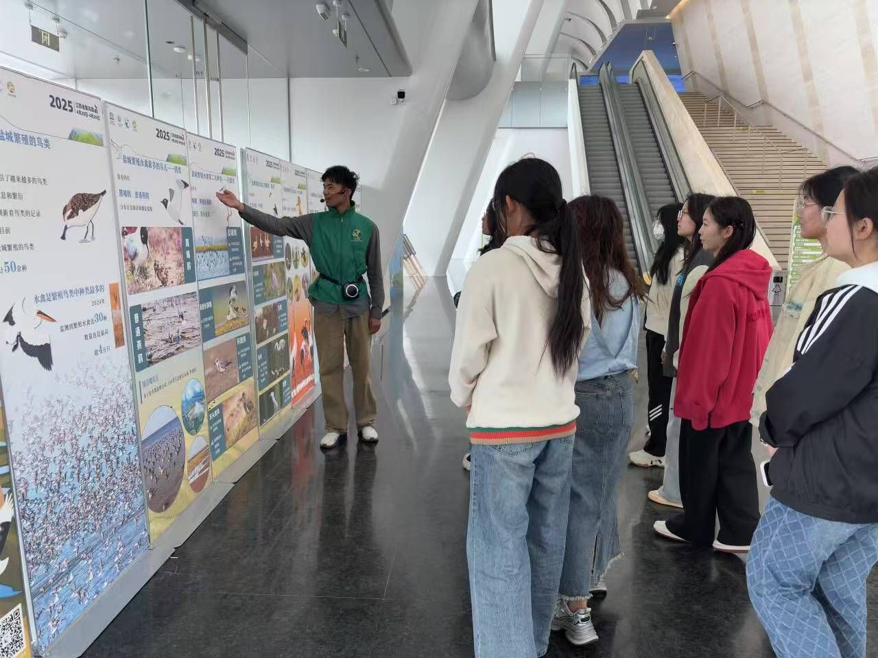 5月1日,为将爱鸟护鸟的理念传播得更远更广,盐城工学院再次组织学生们在黄海湿地博物馆开展鸟类科普志愿服务活动。活动现场,同学们以专业的知识和热情的服务,向过往游客详细介绍黄海湿地在全球候鸟迁徙中的重要战略地位、湿地的奇妙形成过程以及其独特的生态功能。他们通过图文并茂的精彩展示、栩栩如生的珍稀鸟类标本以及引人入胜的互动影像资料,生动讲述着丹顶鹤、勺嘴鹬等珍稀鸟类在盐城湿地栖息繁衍的动人故事。