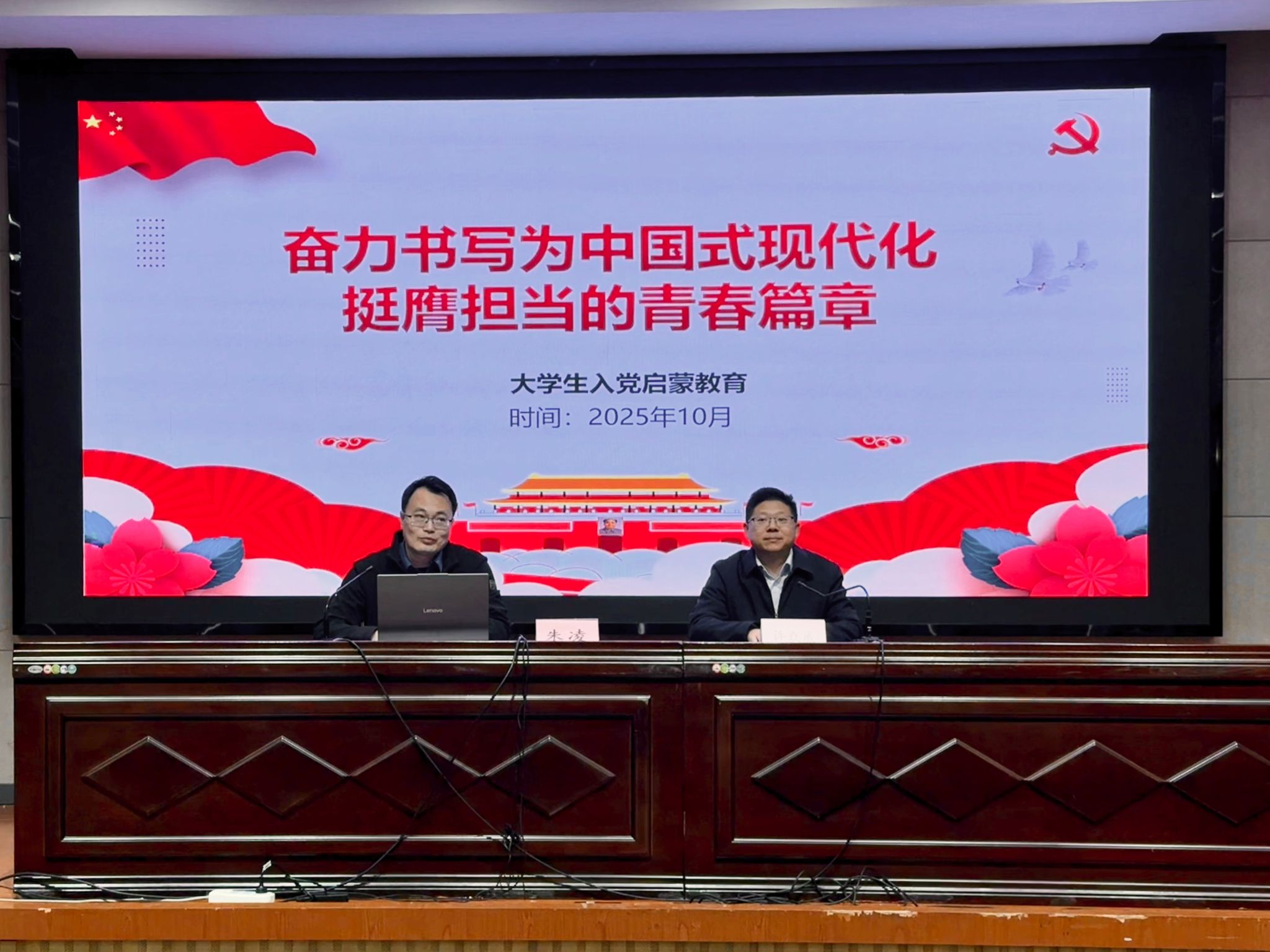 朱凌以“奋力书写为中国式现代化挺膺担当的青春篇章”为主题,重点介绍了“为什么要入党?”“如何加入党?”“怎么加入党?”以及“党员应该怎么做?”等,并着重强调了端正入党动机的重要性以及如何规范撰写入党申请书。他勉励新生坚定理想信念,积极向党组织靠拢,将个人理想融入党和国家发展之中,为中国式现代化建设贡献青春力量。