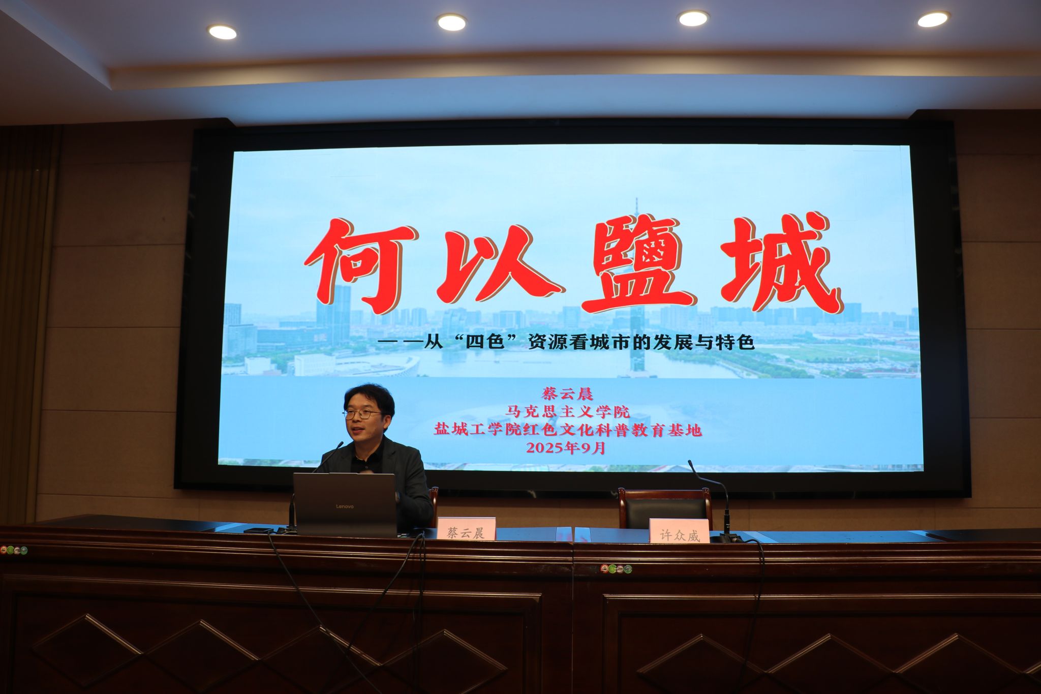 蔡云晨以“何以盐城——从‘四色’资源看城市的发展与特色”为主题,从白色海盐铸就文明根基、红色铁军淬炼精神脊梁、绿色生态书写转型答卷、蓝色海洋开启未来之门等四个方面详细介绍了盐城这座城市的历史、现在及未来。他深刻解读了“铁军精神”的内核与当代意义,勉励同学们从光辉革命历程中汲取力量,将对盐城的深厚情感化为求学动力,在这片红色热土上知行合一,挥洒青春,铸就未来。